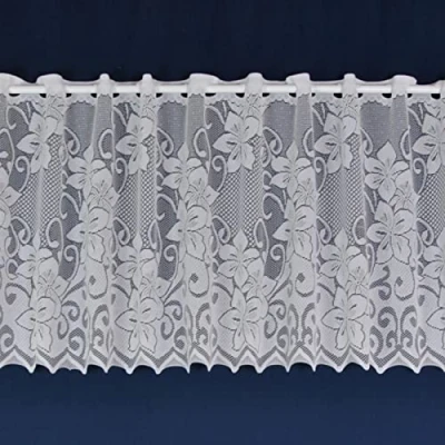 Floral café net has a all over pattern with a lovely scalloped bottom - Metres Wide x 36" (91cm) Drop Floral cafe net curtains has a traditional floral pattern finished with a charming scalloped bottom. This net has lovely bright and modern pattern with lots of detail; a perfect focus for a room and highlight for a window. Nets are a beautiful finishing touch for a window; providing a sense of privacy while still allowing plenty of light to enter a room. Each drop is available in various sizes. Ready to hang with rod / slot top header ideal for a wire or net rod - 100% polyester. These nets are finished in White and are a 100% Polyester. Machine washable on a delicate wash.