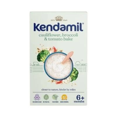 Why Buy Me? Our Cauliflower, Broccoli and Tomato Bake cereal contains the very best of nature. We don’t do palm oil, fish oil or added sugar. What we do do is real vegetables, creamy milk, high quality grains and essential vitamins and minerals. Simple. Kendamil Cauliflower, Broccoli and Tomato Bake cereal is veggie friendly and suitable from six months. Brand: Kendamil Product Type: Baby Food Product Sub-type: Porridge & Cereal How to Use? Contains approximately 7 servings per pack. Keep the packet closed after use and store in a fresh and dry place. Once opened, consume before 1 month. Step 1 Put approximately 2 tablespoons (20g) of porridge in a bowl. Then add approximately 4 tablespoons (55ml) of warm (recently boiled) water. Use as part of a varied weaning diet. Step 2 Stir well and allow to cool, then check temperature before serving. Let your baby's appetite guide you and adjust the amount fed depending on their needs. The consistency can be altered by adding more or less water. Details: No Added Sugar: Kendamil uniquely uses Whole Milk as a source of fat No Palm Oil: Kendamil has and will NEVER used Palm Oil Vegetarian: Kendamil Creamy Baby Porridge is Veggie friendly! Award Winning: Mums across the UK love our Kendamil Porridges Real Vegetable: We use real vegetable!