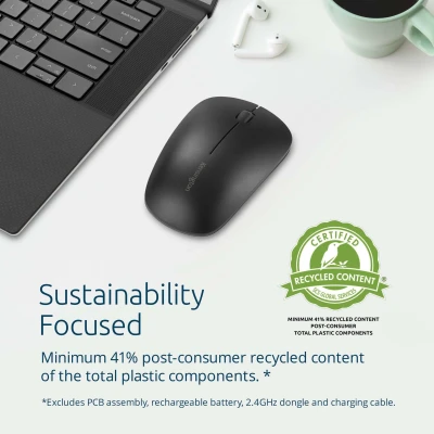 *** CLEARANCE ITEM - LIMITED STOCK AVAILABILITY AT THIS PRICE ***Professionals frequently face challenges in finding reliable and budget-friendly rechargeable mice that contain more sustainable materials.Many are frustrated by mice that lack durability, security, or compatibility with various operating systems. The MY230 EQ Rechargeable Mouse tackles these issues by offering a wireless solution that enhances productivity while integrating more recycled materials.It offers 2.4GHz or Bluetooth® wireless connectivity options and a long-lasting rechargeable battery for months of productivity without the need for frequent recharging.Aimed at increasing our use of recycled material, this product contains 31% post-consumer recycled (PCR) plastic*. Provides two convenient and secure connectivity options – a compact USB-A nano receiver for a reliable 2.4GHz wireless connection with government-grade AES 128-bit encryption, and Bluetooth® (BT 5.0) for seamless wireless connectivity. Windows and macOS compatible.Supports up to 3 months of productivity with a single charge. Includes USB-A to USB-C® cable for charging. Significantly quieter than a standard mouse, the MY230 reduces noise in busy workplaces. Comfortable for both left and right-handed users, it features a center scroll wheel with 3 buttons to support efficient clicking and scrolling.Convenient lights offer visual confirmation of battery life and pairing channels. Supports standard button functionality for instant connectivity or use free downloadable KensingtonWorks™ software to customise your experience to fit workflow needs.*Excludes PCB assembly, rechargeable battery, 2.4GHz dongle, and charging cable.