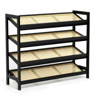 KEPLIN 4 Tier Bamboo and Rattan Shoe Organiser Rack Eco Friendly, Durable, Easy Assembly Compact Design for Entryway, Closet, or Hallway Stylish Functional Storage Black Natural