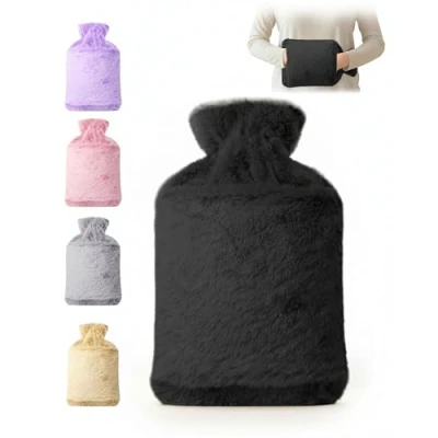 KEPLIN Hot Water Bottle 2L with Soft Faux Fur Cover, Leakproof Natural Rubber, Long Lasting Warmth for Neck, Back & Hands, Fluffy Cosy Design Men Women, Winter Comfort Black