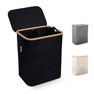Keplin Laundry Basket 145L Capacity with Handles, 2 Machine Washable Removable Bags, Button Toggles & Breathable Fabric Easy Assembly for Home, Bedroom Bathroom Black (57x37x69cm)