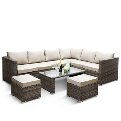 Upgrade your outdoor experience with our luxurious 8-seater outdoor rattan furniture! This garden furniture set includes a comfortable rattan corner sofa, two stools, a coffee table with tempered glass, and 15 thick, lofty sponge-padded water-resistant cushions. The wide and deep chairs provide ample room to sit comfortably and enjoy your leisure afternoon teatime. Crafted from high-quality materials, this rattan patio furniture set is built to last. The strong galvanized steel frame and commercial-grade hand-woven weather-resistant PE rattan won't rust or fade, making it a durable and great addition to your patio, garden, park, or yard. Cleaning and maintenance are a breeze with this easy-to-clean garden furniture set. The removable tempered glass allows for easy cleaning, and the removable covers are machine and hand wash, so you can spend less time cleaning and more time relaxing. Designed for all-year-round outdoor use, this rattan garden furniture set is perfect for outdoor spaces, gardens, balconies, and entertaining areas. Whether you're enjoying a cup of tea or hosting a dinner or a party, this garden corner sofa set provides ample seating and comfort for all your outdoor activities. Includes: 1 x deluxe garden corner sofa (with 7 cushions), 2 x rattan footstools (with 2 cushions), 1 x table with tempered glass top. Dimensions: Seater left-armed sofa - 176x76.3x64.2cm, Seater corner garden sofa - 187.6x76x64cm, Coffee table - 105x55x36.6cm, Footstool - 54x40x30.5cm