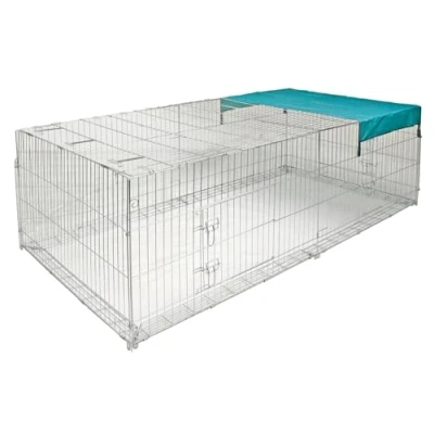 Please ensure that the head of your rabbit does not fit between the bars Outdoor enclosure with escape lock galvanized Includes sun protection shield 4 lateral doors Hinged grille cover Easy to assemble with ground spikes