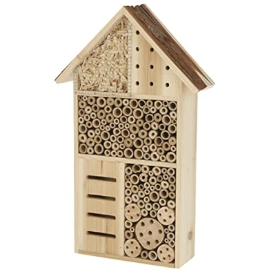 The insect protection house is used for nesting and hibernation aid and is made from natural wood The hollow branches can be used as a nesting place for grave wasps and wild bees In the insect house there is a chamber for butterflies on the side and the wood chips are available for the protection of ant and beetle species The insect protection house is partially covered with metal wire The insect house has a length of 27 cm, a width of 9 cm and a height of 49 cm