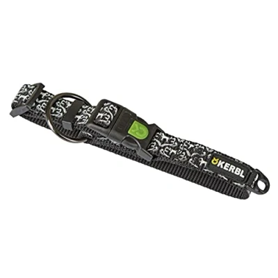 Collar Shiny Night High quality nylon fabric with a highly reflective print design – stores light and glows in the dark Stable, painted metal fittings Steplessly adjustable With traction release Additional eyelet for dog tags or collar light