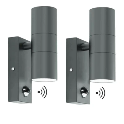 Kerry Outdoor Wall Lights, Up and Down Lamp with Motion Sensor, IP44 Anthracite Grey Stainless Steel Outside Lighting Mains Powered Fixtures, PIR Detector External Sconce for Front Door 2 Pack