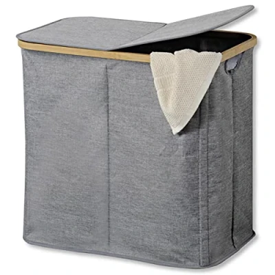 KESPER 19598 Polyester Laundry Hamper (PES) Grey Frame made from FSC certified bamboo (licence number FSC-C014021). With two compartments and flap. Dimensions (W x H x D): 54.5 x 50 x 33 cm. 19598 Laundry Hamper Kesper