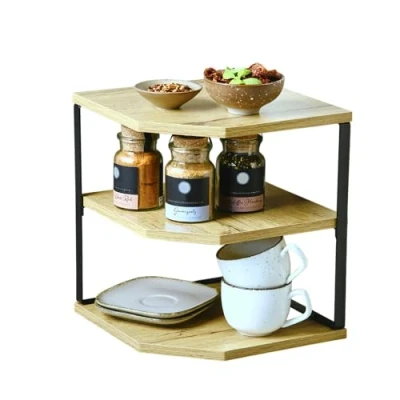 Kitchen corner shelf made from FSC certified fibreboard and metal Measuring 26 x 26 x 28 cm, it fits exactly into the corner of a kitchen, making it an ideal solution to use unused surfaces. The shelf is made from fibreboard certified by the Forest Stewardship Council (FSC). This ensures that the wood has been sourced in an environmentally friendly and socially responsible way. The use of black metal struts not only provides a stylish contrast, but also contributes to the durability and stability of the shelf. The shelf is both functional and decorative. Here, various kitchen utensils, spices and dishes can be stored, enhancing the overall look of the kitchen area. Easy to clean with a damp cloth.