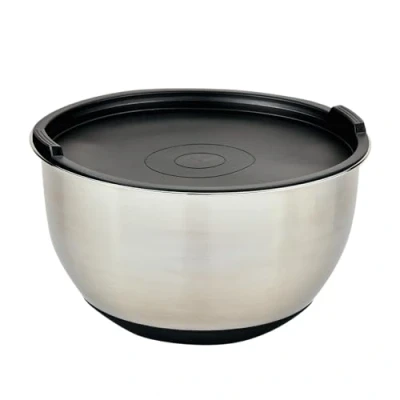 Stainless steel mixing bowl with plastic lid The bowl is suitable for stirring, mixing, storing and serving various foods and ingredients - ideal for doughs, dips, salads etc. The plastic lid allows the contents of the bowl to be airtight sealed, making it easier to store food and maintain its freshness longer. The silicone base ensures stability and prevents the bowl from slipping during use, which improves handling and safety. With a diameter of 26 cm and a height of 15 cm, the bowl offers enough space for preparing different recipes without being too bulky. The use of stainless steel for the bowl and plastic for the lid means it is durable and easy to clean. The bowl is dishwasher safe, the lid requires hand cleaning Capacity: approx. 5 litres The integrated measuring scale with litre indications makes it easy to measure ingredients directly in the bowl, saving time and dishes.