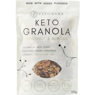 Keto Hana Coconut and Almond Granola Diet Vegan Grain Free Dairy Plant Based No Refined Sugars Gluten 1.1g Net Carbs Breakfast Cereal 300gr/0.6lbs