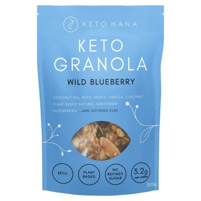 Keto Hana Wild Blueberry Keto Granola 300g is a plant-based, low-carb granola made with coconut, nuts, seeds, vanilla, a natural sweetener blend, and wild blueberries, containing no refined sugar or preservatives for a healthy and delicious snack or breakfast option.