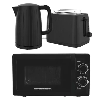 Amazon3-Piece Black Kitchen Set: Includes 20L black microwave with stainless steel cavity, 1.7L Stealth fast boil kettle and 2-slice toaster with warming rack. 20L 700W Microwave (Black): Manual dial controls, 5 power levels, quick defrost, stainless steel interior and 30-minute timer – compact yet powerful. 1.7L Stealth Fast Boil Kettle: 3000W rapid boiling, auto shut-off, boil-dry and overheat protection, water level window, built-in filter and cord storage. Stealth 2-Slice Toaster (Black): Extra-wide slots, 8 browning levels, centering function, defrost, reheat and cancel settings plus integrated warming rack. Modern Matte Black Design: Sleek black microwave with stainless steel cavity combined with matching Stealth kettle and toaster for a coordinated, stylish kitchen., Weight: 33.0693393 Pounds, Manufacturer: Hamilton Beach