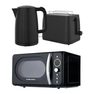 Upgrade your kitchen with the Hamilton Beach Black FlexiControl Kitchen Set – a premium 3-piece appliance bundle designed for convenience, accuracy and sleek modern styling. This set includes a 20L digital microwave, a FlexiControl temperature-controlled 1.7L kettle and a matching 2-slice digital toaster, all in elegant matte black. With matching black finishes and digital control features, this set brings a premium, cohesive look to any modern, minimalist or luxury-style kitchen. Key Features You'll Love: Stylish Black Retro Kitchen Set: Includes 20L retro microwave, 1.7L Stealth fast boil kettle and 2-slice toaster with warming rack – all in matte black. Retro 20L 700W Microwave (Black): Digital LED display, 8 pre-set programmes, express cooking, weight defrost, 60-min timer and child lock. 1.7L Stealth Fast Boil Kettle: 3000W power, auto shut-off, boil-dry and overheat protection, water level window, built-in filter and cord storage. 2-Slice Stealth Matte Black Toaster: Extra-wide