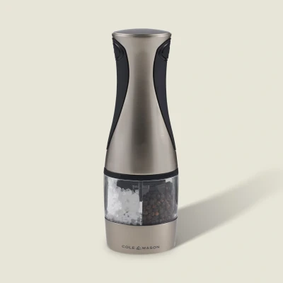 The Kew Electronic 2-in-1 Duo Mill is a space-saving solution that combines salt and pepper grinding in a single device. Featuring adjustable grind settings and a stylish design, it provides convenience and efficiency. The battery-operated mechanism allows for effortless one-handed operation, while the clear viewing window ensures you can easily monitor spice levels. Its modern and ergonomic design makes it a practical addition to any kitchen.