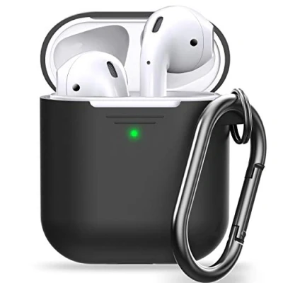 Keybudz PodSkinz AirPods Case Elevate [Front LED Visible] Protective Silicone Cover Compatible with 1 & 2 (Gen 2) (with Carabiner, Black)