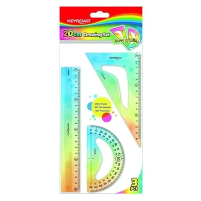 Retail kit for each student. Scale according to the standards. Set: ruler 20 cm, protractor 10 cm, set square 14 cm Colour: A random mix of pastel colours