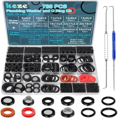 KEZE 780 PCS Rubber Washer Assortment Kit 14 Size Water Hose Washers and 18 Nitrile O Ring Set for Outside Faucet Spigot Garden Pressure Plumbing Repair OD 5 33MM