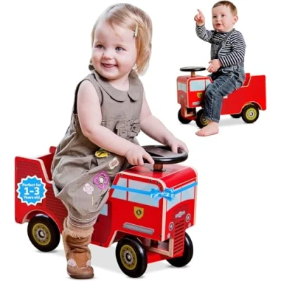 Kiddimoto Wooden Kids Ride On Car/Walker for Toddlers Children From 12 Months To 3 Years Walk & Drive 2 in 1 Toys Vehicle (Red Fire Engine)
