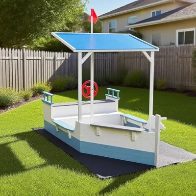 BOAT-SHAPED DESIGN: Charming nautical-themed sandpit features a realistic boat shape with blue and white colouring, complete with steering wheel, flag pole, and seating areas for imaginative maritime adventures PROTECTIVE CANOPY: Includes a large blue canopy measuring 97.5cm x 74.5cm that provides essential shade and sun protection for children during outdoor play sessions INTERACTIVE FEATURES: Equipped with a red steering wheel for role-play, multiple seating benches on different levels, and a flag pole with red flag to enhance creative play experiences GENEROUS DIMENSIONS: Overall measurements of 218cm length x 100cm width x 160cm height (including canopy) provide ample space for multiple children to play together comfortably GARDEN PROTECTION: Comes complete with a base sheet to protect your lawn or garden surface from sand spillage and moisture whilst keeping the play area clean, Manufacturer: RayGar