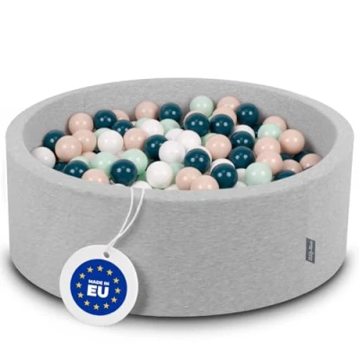 KiddyMoon 90X30cm/200 Balls ∅ 7Cm / 2.75In Baby Foam Ball Pit Made In EU, Light Grey:Dark Turquoise/Pastel Beige/White/Mint