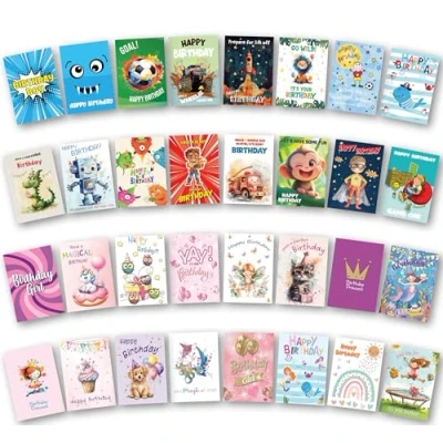 Kids Birthday cards pack of 32. Mixed Girl and Boy Cards. Each Card Multipack includes 16 for Boys Girls. Ecofriendly UK made. Blank inside. Large 172 x 122mm size