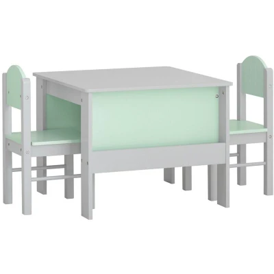 General description Modern design children table and 2 chairs set will blend perfectly with any decor. An ideal addition to any playroom and children’s room, this 2 in 1 design integrates a bookshelf into the table, with storage shelves on both sides for books, optimizing space. The chair features a backrest for a firm and comfortable sitting experience. When not in use, the two chairs can be stored under the table to save space. This set is designed at the ideal height for little ones, with rounded corners to prevent collisions and injuries. Made of high-quality MDF in light grey and light green lacquer, the chair legs are constructed from MDF and solid wood, ensuring sturdiness and stability. This multifunctional table and chair set is perfect for drawing, learning, playing, eating, and other activities, making childhood enjoyable. Technical specifications Material: MDF, wood Dimensions: Table: W60 x D60 x H48 cm Chair: W25 x D28 x H55 cm Seat height: 27 cm Weight: 13.5 kg Load