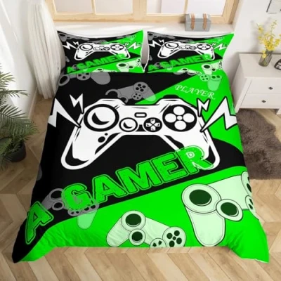 Kids Gaming Bedding Sets Double Size Boys Gamepad Gamer Duvet Cover Set Cartoon Lightning Game Console Comforter Video Games Bedspreads Room Decor With 2 Pillow Cases Green Black