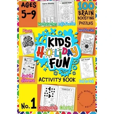 Kids Holiday Fun Activity Book For Ages 5,6,7,8,9: Brain Boosting Puzzles including Crossword, Wordsearch, Mazes, Dot to Dot, Spot the Difference, Coloring