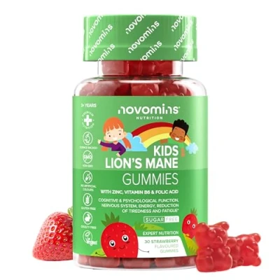 Kids Lions Mane Gummies 30 Sugar Free Mushroom Complex with Zinc, Vitamin B6, Folic Acid Supplement for Mental Performance Vegan Strawberry Flavour Novomins