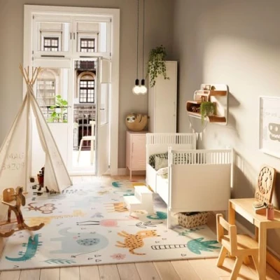 Kids Nursery Rug Safari Theme Multicolour Cute Baby Play Mat Non Slip Washable White Foldable Crawling Floor Childrens Rugs Water Resistant Jungle Bedroom Cartoon Animals Large 190cm x 280cm