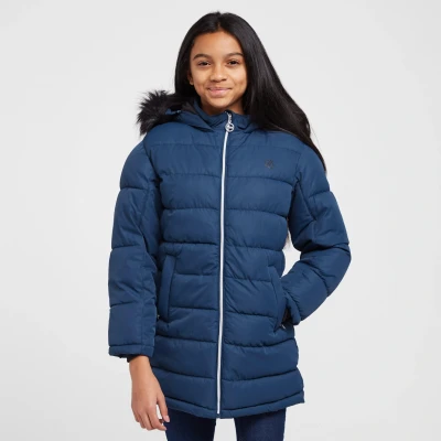 The taped seams, water-repellent finish and Dare 2b's Ared 8000 fabric will keep your little ones warm and dry in a sudden downpour or drizzle. The jacket is lined with high warmth padding making sure your kids are kept warm and comfortable. The hood comes with a detachable faux fur trim which makes for easy washing. Engineered with Dare 2b's Ared 8000 fabric - providing durable waterproofness Recycled high warmth padding Metal luxe badge & zip pullers embellished with Swarovski crystals age 9+ Fixed adjustable hood with detachable faux fur trim 2 x lower zip pockets Material: 100% polyester (15 bottles were recycled to make this jacket) Colour: Navy