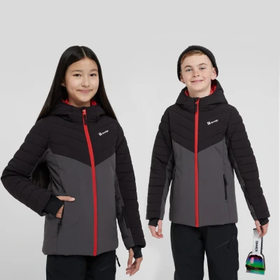 Block out the cold and make sure your young skiing protégé has the time of their life in the mountains with the Sun Peaks Jacket, by The Edge. Designed for mid-winter skiing, this insulated ski jacket is always warm, and, thanks to its PFC-free DWR coating, weather resistant too. Loaded with pockets-a-plenty for everything from cold fingers to ski passes, this jacket also has ski specific features such as a snow skirt, to prevent snow from getting into the jacket. · 100% Synthetic insulation · PFC-free Durable Water Repellent finish · Taffeta and fleece lining · Stitch through baffle construction · Elasticated hood · Internal stretch wrist cuffs · Ski pass pocket · Internal snow skirt · Fleece-lined hand pockets · Easy-grab looped zip pulls · Large internal goggle pocket · Regular fit · Fabric: 94% polyamide, 6% elastane · Colour: Black