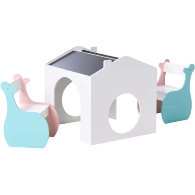Blackboard Table and Chairs Set. This adorable 2-chair and table set is the perfect addition to any kid’s room. Crafted from durable and easy-to-maintain MDF, the table features a blackboard-painted top, ideal for creative chalk drawings. It’s a wonderful space for children to engage in imaginative activities and develop manual skills, all while blending seamlessly with any decor. Details: Product Type: Kids Tables and Chairs General Color: Multicolour Material Type: Engineered Wood Main Material: MDF Legs material: Engineered Wood Top Material: Engineered Wood Finish: Laminated Seats Up To: 2 People Dimensions: Chair Dimensions: 31x32x45 cm Seat Height: 17 cm Table Dimensions: 58x58x60 cm Overall Dimensions: 58x58x60 Weight: 15 kg Chair Weight Capacity: 20 kg Table Weight Capacity: 10 kg Offer Includes: 2 x Chair, 1 x Table Key Features: Designed to Complement Any Child's Bedroom, Blends Well with Any Decor, Easy Care and Durable Materials, High Quality, Safe and Stable Mounting