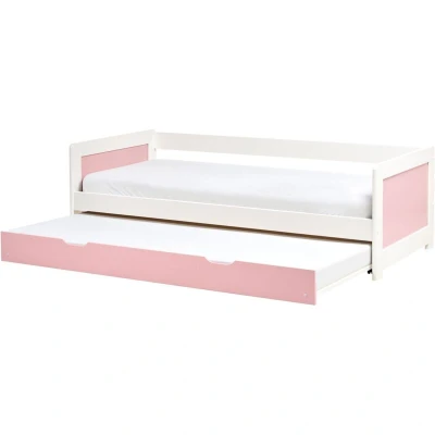 General description This charming trundle bed, crafted from pine wood painted in pink, adds a warm and natural touch to any kid's bedroom. With its clever double bed design, it's perfect for sleepovers or growing families, providing extra sleeping space while maintaining a compact footprint. The versatile style seamlessly fits into a variety of interior decor themes, from modern to Scandinavian-inspired spaces. Durable and aesthetically pleasing, it's an ideal solution for both functionality and style in your child's room. Technical specifications Product Type: Daybed Style: Scandinavian General Color: Pink, White Main Material: Pine Wood Dimensions: Width: 96/188 cm, Length: 206 cm, Height: 63 cm Sleeping Surface: 90 x 200 cm Weight: 39 kg Weight Capacity: 120 kg Headrest Dimensions: 96 x 63 x 3 cm Finish: Painted Installation Full assembly required Estimated assembly time: 45-60 minutes Usage Sleeping surface can be doubled thanks to the pull-out frame Perfect for both a bedroom and
