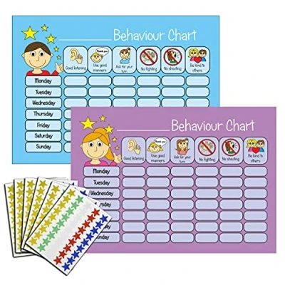 BEHAVIOUR REWARD CHART: Help monitor and improve your child's behaviour with this bright and colourful behaviour reward set. EASY TO UNDERSTAND: Clear and simple visuals make this chart perfect for children young and old. MOTIVATE: Reward and motivate your child with a range of colourful star stickers that they can place each day SIX BEHAVIOURS: Good listening, Use manners, Ask for your turn, No fighting, No shouting & Be kind to others. PACK CONTENTS: 1 x Boys Behaviour Chart + 1 x Girls Behaviour Charts + 270 Star Stickers, Manufacturer: Happy Learners Limited