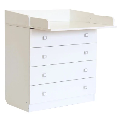 General description The Kidsaw Kudl Kids 4 Drawer Unit 1580 with Changing Board and Storage in White combines high quality with an appealing design, making baby care easier. The practical changing table features four spacious drawers that provide ample storage space for all necessary items, keeping your hands free for your child. Its discreet design allows it to fit seamlessly into any room and style of living. The foldable changing mat saves space and transforms the changing table into a chest of drawers once your child no longer needs it. Technical specifications Dimensions (HxWxD): 92 cm x 80 cm x 47 cm Weight: 38 kg Changing area dimensions (WxD): 74 cm x 77 cm Other information Manufactured from environmentally friendly materials: MFC chipboard from Kronospan (Austria), high-quality paint, and reliable fittings Complies with European standards DIN EN 716: 1 for baby and child safety Features ergonomic handles and removable changing mat that leaves no marks on the dresser