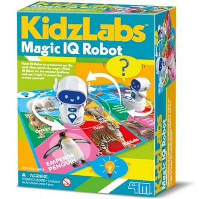 EDUCATIONAL VALUE: Interactive learning game featuring a Magic IQ Robot that reveals answers to questions about animals, maths, sea life, human organs and more through an innovative spinning mechanism COMPREHENSIVE SET: Includes Magic IQ Robot, question card holder, answer platform, and 6 sets of educational cards (12 pieces total) covering diverse topics for extended learning AGE APPROPRIATE: Designed for children aged 5 and above, providing an engaging way to learn facts about science and nature through play-based discovery EASY TO USE: Simply point the robot to a question on the card, place it on the answer platform, and watch it spin to reveal the correct answer magically MULTIPLE SUBJECTS: Features various educational themes including wildlife, marine biology, mathematics, and human anatomy, offering broad learning opportunities, Manufacturer: 4m