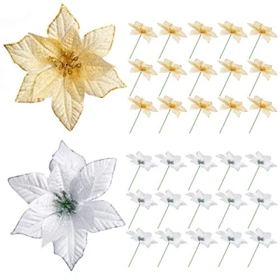 Kiiwah 30pcs Artificial Christmas Tree Flowers Glitter Poinsettia Decorations Silver and Gold Ornament Party Decor