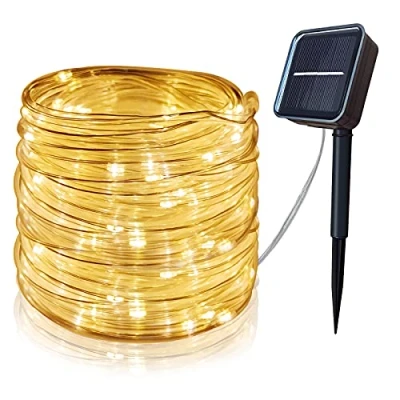 【HIGHLY QUALITY SOLAR ROPE LIGHT】Our solar rope light with 100 pcs low-heat-emission LED bulbs is fully covered by clear PVC tubes, the tubing of the firefly lights is durable and flexible with steady 360 degree viewing angle they illuminate in every direction, Ideal for decorating your gardens, patio, gate, yard, wedding, party, christmas. 【LONG TIME LIGHTING】The outdoor solar rope lights with 800MaH solar batteries and A-level solar chips have higher energy conversion efficiency, it can provide 6-8 hours lighting at night after fully charged. 【8 WORKING MODES & ATUO ON/OFF】 The solar powered lights have have 8 working modes - Combination, In Waves, Sequential, Slo-Glo, Chasing/Flash, Slow Fade, Twinkle/Flash, Steady on,these models can create different atmospheres according to different occasions.And,these solar string lights can charge during the day and automatically turn on at dusk and off at dawn. 【WATERPROOF DESIGN】Both the string lights and the solar panel are IP65 waterproof,so it is suitable for both indoor and outdoor use,you needn't worry about short circuit or weather damage. 【EASY INSTALLATION & OPERATION】It's very easy to decorate your outdoor space with this solar rope lights. You can install the solar lights in any corner can the solar panel faces directly to the sun and no tools required.There are only two switch (Power ON/OFF and Light Mode) to control the light easily.