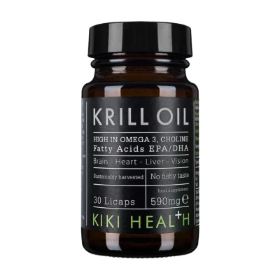 KIKI Health Krill Oil, 590mg - 30 Liquid Capsules provides a potent blend of omega-3s (EPA/DHA), phospholipids, astaxanthin, and choline for heart, brain, and joint support. Easy-to-swallow Licaps ensure rapid absorption with no aftertaste, sourced from pure Euphausia superba krill oil.