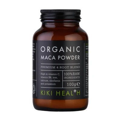 KIKI Health Maca Powder 100g is a 100% raw, organic blend of four maca root varieties from the Peruvian Andes, rich in vitamin C, B vitamins, minerals, and fibre. Traditionally used for energy and vitality, it offers a caramel flavor and can be added to smoothies, cereals, and desserts.
