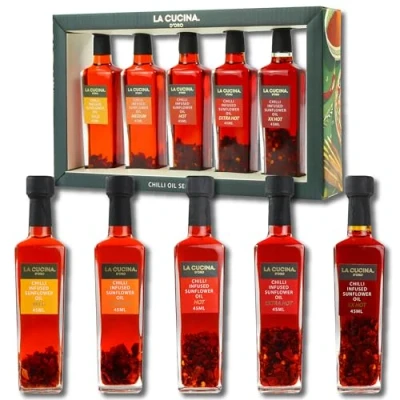 Gift-ready chilli oil selection for food lovers; ideal for birthdays, Christmas and dinner hosts. Five Heat Levels in One Set: includes Mild, Medium, Hot, Extra Hot, and XX Hot chilli infused sunflower oils (5 x 45ml bottles), allowing you to explore different intensities and find your perfect match for any dish or taste preference Versatile Cooking and Finishing Oil: drizzle over pizza, pasta, salads, and risotto; use as a dipping oil for bread; add warming depth to roasted vegetables, jacket potatoes, or homemade popcorn; enhances both everyday meals and special occasion dishes Premium Gift Packaging Ready: presented in luxury cut-out display box with detailing and attractive artwork; suitable for birthdays, Christmas, housewarming, or any celebration for food lovers and cooking enthusiasts Italian Inspired Flavour Profile: authentic Mediterranean-style infused oils bring restaurant-quality taste to home cooking; each 45ml bottle (16cm tall) contains visible chilli pieces suspended in clear red oil for visual appeal What's Included: 5 glass bottles of chilli infused sunflower oil in graduated heat levels; complete gift set measures 27.5cm x 16.5cm x 5cm depth; designed in Britain by KIMM & MILLER: British-designed gifts for the ones you love