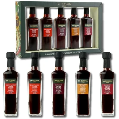 Perfect for Gifting: Five elegant 45ml glass bottles presented in luxury cardboard packaging with gold foil detailing, making this collection ideal for birthdays, Christmas, housewarmings or thank-you gifts for food enthusiasts Five Authentic Italian Flavours: Cherry adds fruity sweetness to desserts and fruit salads; Chilli brings heat to pizzas and pasta; Fig pairs beautifully with cheese platters; Pomegranate enhances salad dressings; Raspberry complements ice cream and panna cotta Versatile Cooking Companion: Each 6% acidity balsamic vinegar drizzles perfectly over salads, roasted vegetables, risotto and grilled meats, or mix with olive oil to create gourmet vinaigrettes and dipping oils for bread Cook, Dip Or Drizzle: Try over salads, pizzas and roasted veg, whisk into vinaigrettes, glaze meats, or serve with olive oil for a simple bread dip and cheeseboard pairing. Practical And Considered: Glass bottles are recyclable or reusable; outer box is recyclable cardboard. Contains sulphites. Handle glass with care and store in a cool, dark place. What You Receive: One gift set containing five 45ml bottles (total 225ml) in the following flavours - Cherry, Chilli, Fig, Pomegranate and Raspberry; all bottles clearly labelled and ready to use straight from the box ✅ WELCOME TO KIMM & MILLER: British-designed gifts for the ones you love