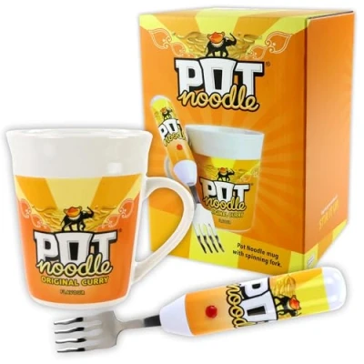Kimm & Miller Pot Noodle Gift Set with Spinning Fork Mug Funny Novelty Gifts for Men, Women, Teens Students Original Curry Design