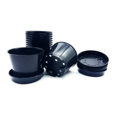 Flower pot 11 cm in diameter with matching saucer Pack of 10 plant pots with saucer Made of recycled plastic, solid design and therefore very durable Black