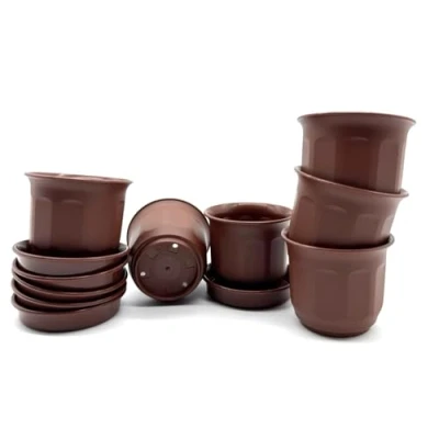 Pack of 6 mini flower pots with saucers for planting and attracting small plants Colour: brown Other colours: white, grey Outer diameter 6.5 cm, inner diameter 5 cm, height 5.5 cm