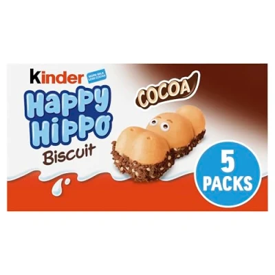Chocolate gifts and treats that will make your family and friends smile Crispy Wafer Biscuit With a Milky And Cocoa Filling Kinder Happy Hippo is a crispy hippo shaped biscuit with a double cream filling It is available in two different, yummy flavours - cocoa and hazelnut Free From Artificial Colours