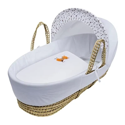 Kinder Valley Embroidered Fox Palm Moses Basket with Natural Folding Stand, Adjustable Hood, Fibre Mattress & Padded Liner