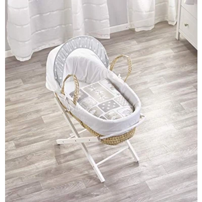 Kinder Valley How Many Sheep Palm Moses Basket with White Folding Stand, Adjustable Hood, Fibre Mattress & Padded Liner